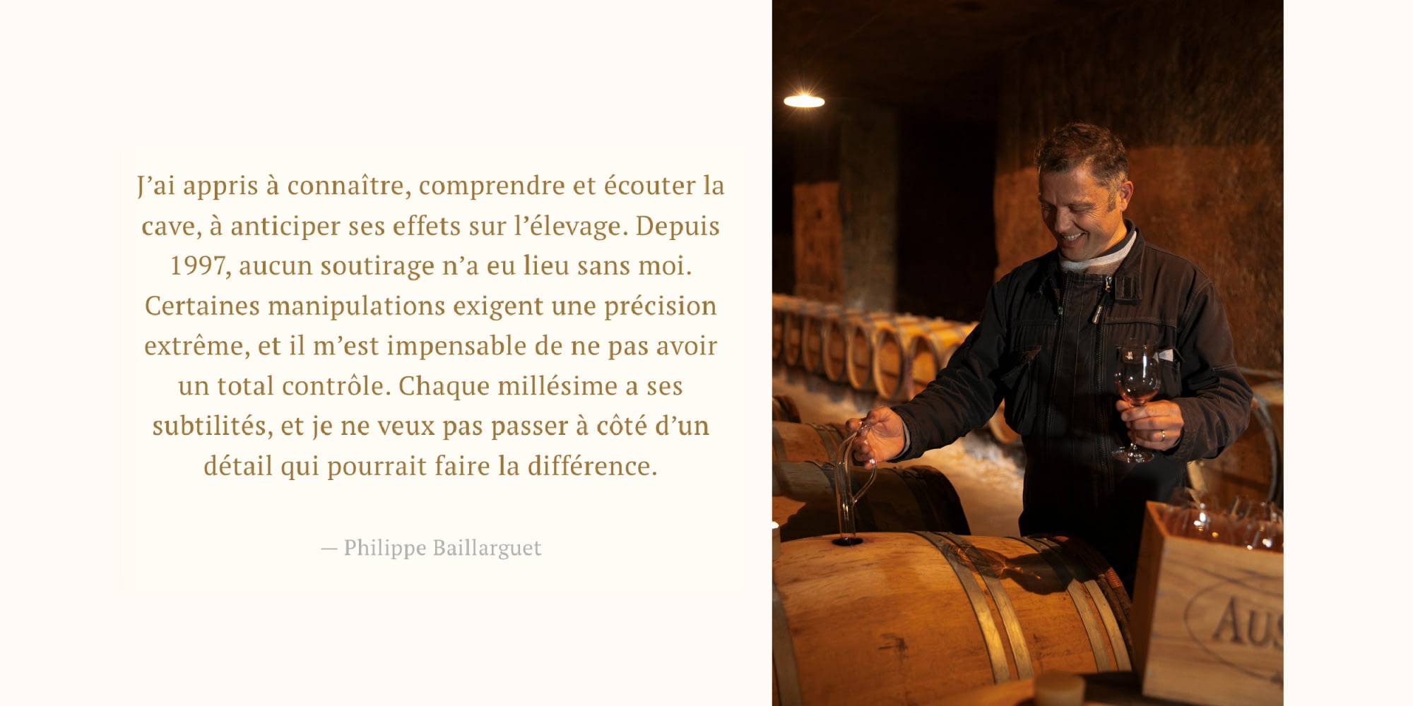 Philippe Baillarguet en est le gardien passionné : "Ce lieu où tout est ralenti impose une discipline unique. L’humidité constante de 100% et la température naturellement stable entre 11 et 15°C nous offrent un cadre idéal, mais aussi un défi permanent. Ici, chaque geste est mûrement réfléchi car chaque décision impacte l’expression finale du vin."